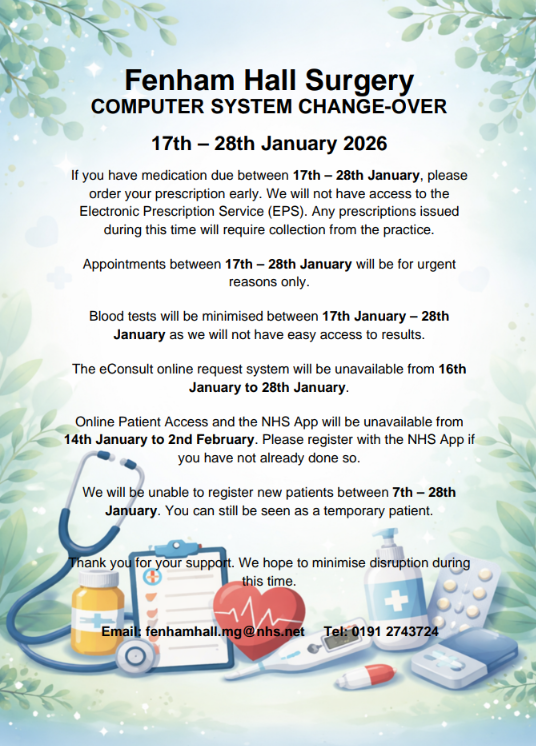 If you have medication due between 17th – 28th January, please order your prescription early. We will not have access to the Electronic Prescription Service (EPS). Any prescriptions issued during this time will require collection from the practice.